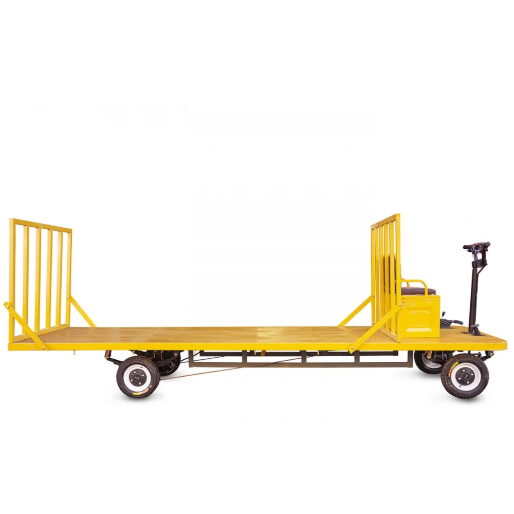 Оснащенность модели бесщеточным редукторным электродвигателем мощностью 1800 Вт и емкой батареей на 32 А*ч позволяют разогнаться до скоростных показателей 25 км/час и преодолеть расстояние до 30 км. Стальная конструкция кузова оснащена высокими съемными бортами, увеличивающими степень практичности техники, исключающими случайное падение груза и другие форс-мажорные ситуации. При максимальной загруженности – до 1000 кг тележка может двигаться на минимальных передачах.