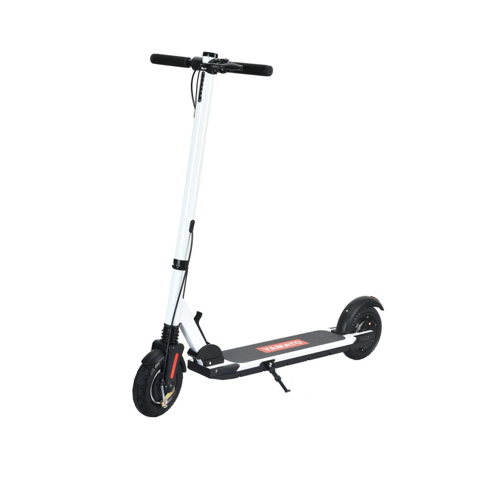 Электросамокат YAMATO PES 0809PRO – завоевал на рынке самокатов массу положительных отзывов и высокий рейтинг. Данное транспортное средство выгодно отличает его от самокатов других марок мощной батареей ёмкостью 36v10ah. Преимущество Yamato PES 0809PRO так же в мощности двигателя – 350 Вт, что позволяет набрать скорость до 25 км в час. Возможность проезда на одном заряде – 35 км, вам не придётся беспокоиться о дополнительной подзарядке долгое время. На самокате установлены передняя и задняя светодиодные фары с функцией стоп-сигнала. Фары отлично освещают дорогу в тёмное время суток. Размер колёс – 8 дюймов. Весит самокат всего 12 кг, он складной. Прекрасно подойдёт для катания на нём взрослыми и детьми. Выпущен в белом цвете. Дизайн строгий. На нём установлены только те детали, которые необходимы для комфортной и безопасной поездки. Мощный двигатель и дополнительная гидроизоляция с аквазащитой IP55 делает безопасной катание в дождливую погоду. У модели PES 0809PRO батарея находится в деке электросамоката, что делает его весьма резвым с дальней проходимостью. Выдерживает нагрузку до 120 кг. Тормоз в данном самокате есть ручной дисковый и ножной. Управление самокатом простое, не требует дополнительных технических знаний.