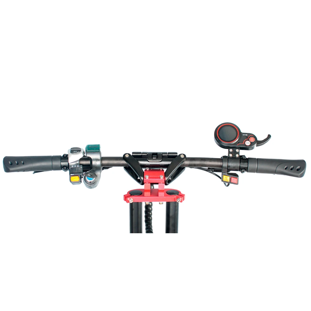 Органы управления электросамоката (газ, тормоз) расположены на рулевом механизме, текущая информация (скорость, заряд аккумуляторной батареи) отображаются на дисплее.