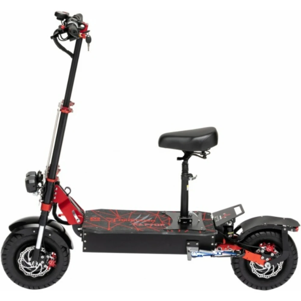 Его уникальность заключается в его невероятных характеристиках, которые обеспечат владельцу высокую скорость движения (до 90 км/ч), потрясающий запас хода (до 70 км) и комфортное управление. Это настоящий внедорожник в мире электросамокатов. 13 дюймовые внедорожные колеса и мощные моторы ( в совокупности 5000w) позволят совершать прогулки в любых условиях. Электросамокат Yokamura Raptor 13 объединил в себе новейшие разработки, технологии и инновации в области производства электросамокатов. Брутальный дизайн в купе с широкими возможностями по максимальной нагрузке (до 150 кг) отлично подходит для представителей мужского пола.