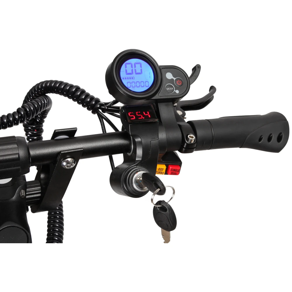 Повышенная проходимость агрегата порадует любителей загородных поездок. Он преодолевает подъемы в 45 градусов, подъемистый и резвый. Быстро набирает скорость, максимальные показатели которой составляют 60 км/ч. Полный привод способствует маневренности электросамоката. При спокойном передвижении можно отключить одно мотор-колесо.