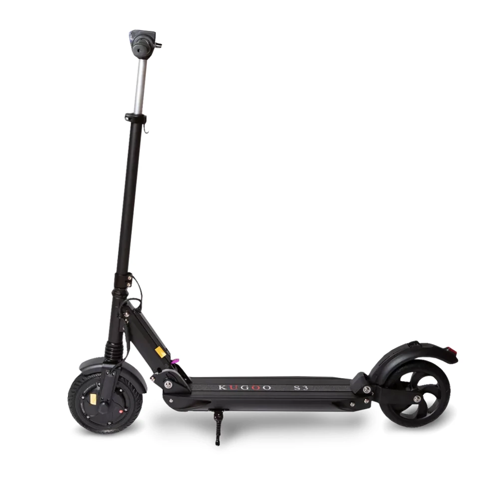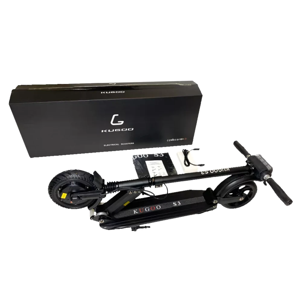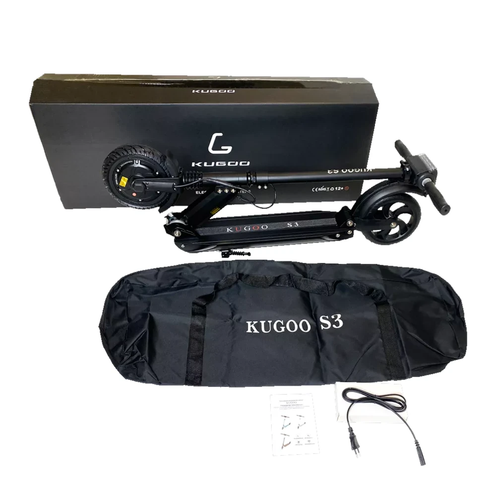 Самокат Kugoo S3 имеет запатентованную складную конструкцию, в сложенном состоянии его легко транспортировать. Его вес 11 кг позволяет переносить агрегат в руках и брать в общественный транспорт. Есть бортовой компьютер, светодиодная фара.