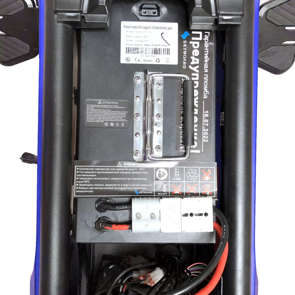 Быстросъемный аккумулятор расположен под сиденьем водителя и имеет следующие характеристики - 63V и 50Ah. Так же есть место дополнительное место для второй батареи.