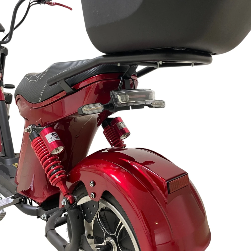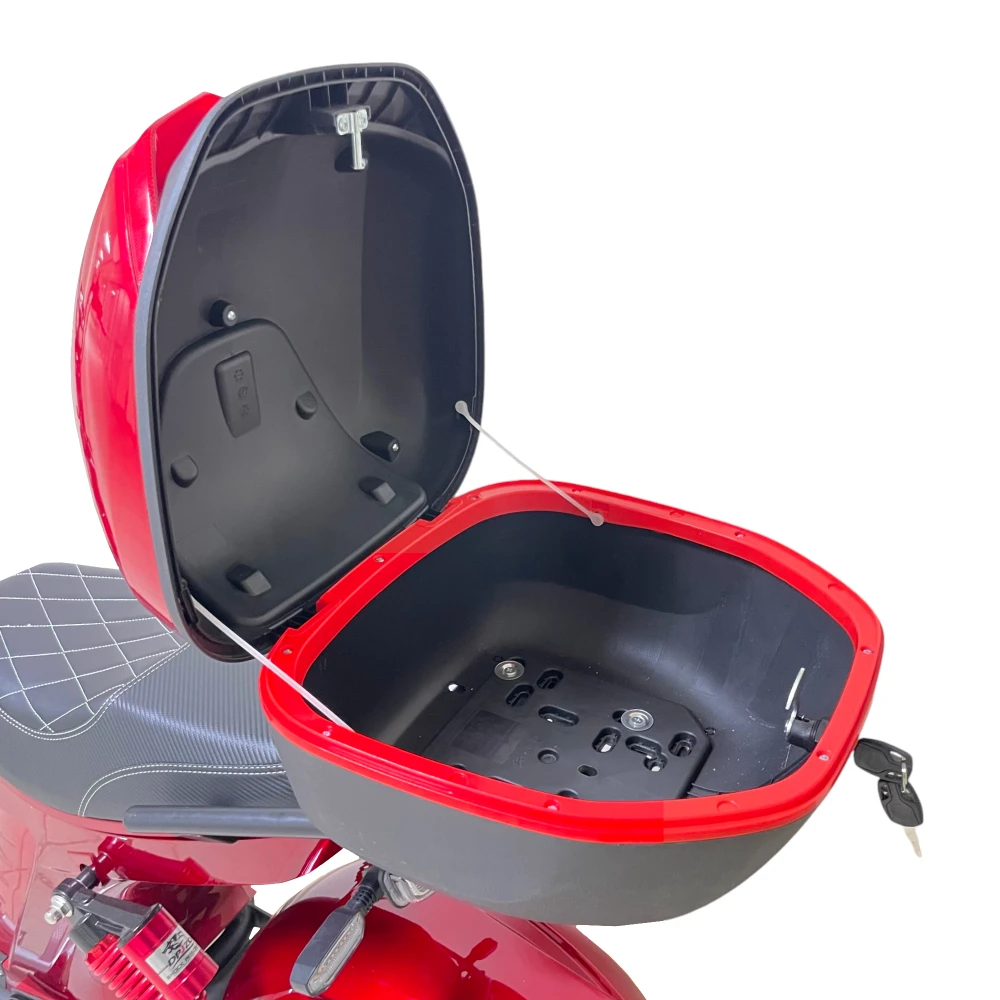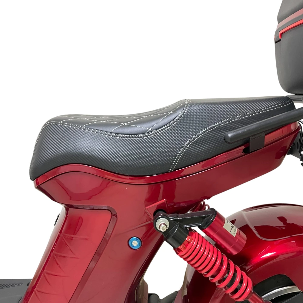 Безопасность и комфорт — в приоритете: дисковые гидравлические тормоза на заднем приводе и двухподвесные амортизаторы гарантируют плавное и уверенное торможение. Скутер выдерживает нагрузку до 200 кг, а большой кофр позволяет брать с собой все необходимое. Литые диски и формат CityCoco с широкими покрышками обеспечивают устойчивость и комфорт на дороге.