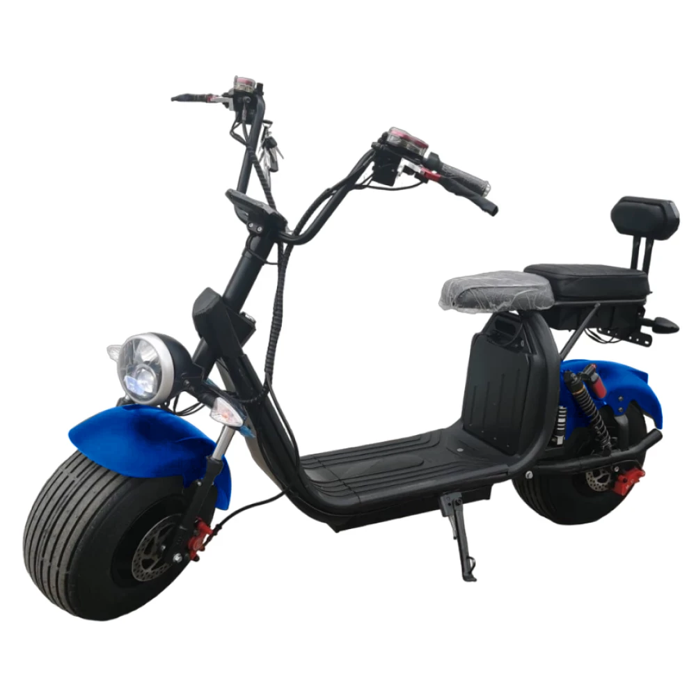 Электроскутер Ikingi X7 PRO в ярком синем цвете. Мощностью 3000 Вт, он может развивать скорость до 60 км/ч, обеспечивая пробег до 45 км на одном заряде. Это идеальный выбор для тех, кто ищет скорость и долгую работу без подзарядки. Гидравлические дисковые тормоза обеспечивают отменное торможение, а задний привод - плавную езду. Формат CityCoco с широкой платформой для ног и большими покрышками делает X7 PRO идеальным для городских поездок. Большая фара и стоп-сигнал, поворотники, амортизаторы спереди и сзади - все это обеспечивает безопасность и комфорт в дороге. Выдвижные ножки для второго пассажира делают его идеальным для парной езды.