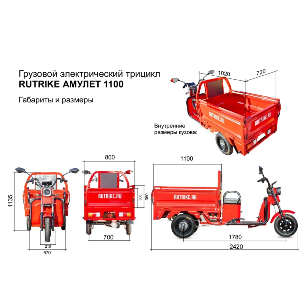Грузовой электротрицикл Rutrike Амулет 1100 60V650W в сером цвете представляет собой надежное и мощное средство для перевозки грузов. Он оснащен мощным мотором мощностью 650 Ватт, который обеспечивает достаточную скорость и уверенное передвижение по дорогам и тропам.