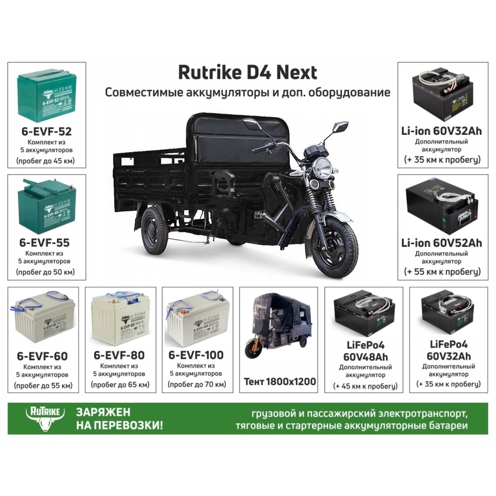 Грузовой электротрицикл Rutrike D4 NEXT 1800 60V1200W в черном цвете — это мощное решение для транспортировки грузов, которое сочетает в себе стиль и высокую производительность. Его впечатляющий дизайн и функциональность делают его идеальным выбором для бизнеса, стремящегося к эффективности и экологичности.С мощностью двигателя 1200 Ватт, этот электротрицикл способен легко справляться с различными задачами. Вес в 240 кг обеспечивает стабильность на дороге, а максимальная нагрузка до 1200 кг позволяет перевозить значительные объемы грузов без ущерба для производительности.С Rutrike D4 NEXT вы можете рассчитывать на пробег до 80 км на одном заряде благодаря высокоэффективному аккумулятору Li-ion ёмкостью 60V. Это означает, что вы можете выполнять доставку и перевозки в течение всего рабочего дня без необходимости частой подзарядки. Время зарядки аккумулятора составляет всего 5-8 часов, что позволяет быстро подготовить транспортное средство к работе.Максимальная скорость 25 км/ч делает этот электротрицикл идеальным для городских условий, где маневренность и скорость имеют решающее значение. Приобретая Rutrike D4 NEXT 1800 60V1200W у официального дилера, вы можете быть уверены в качестве и надежности вашего транспортного средства.Этот электротрицикл не только удобно использовать, но и помогает сократить углеродный след, что является важным аспектом в современном мире. Rutrike D4 NEXT — это не просто транспорт, это шаг к будущему, где грузоперевозки становятся более экологичными и эффективными.