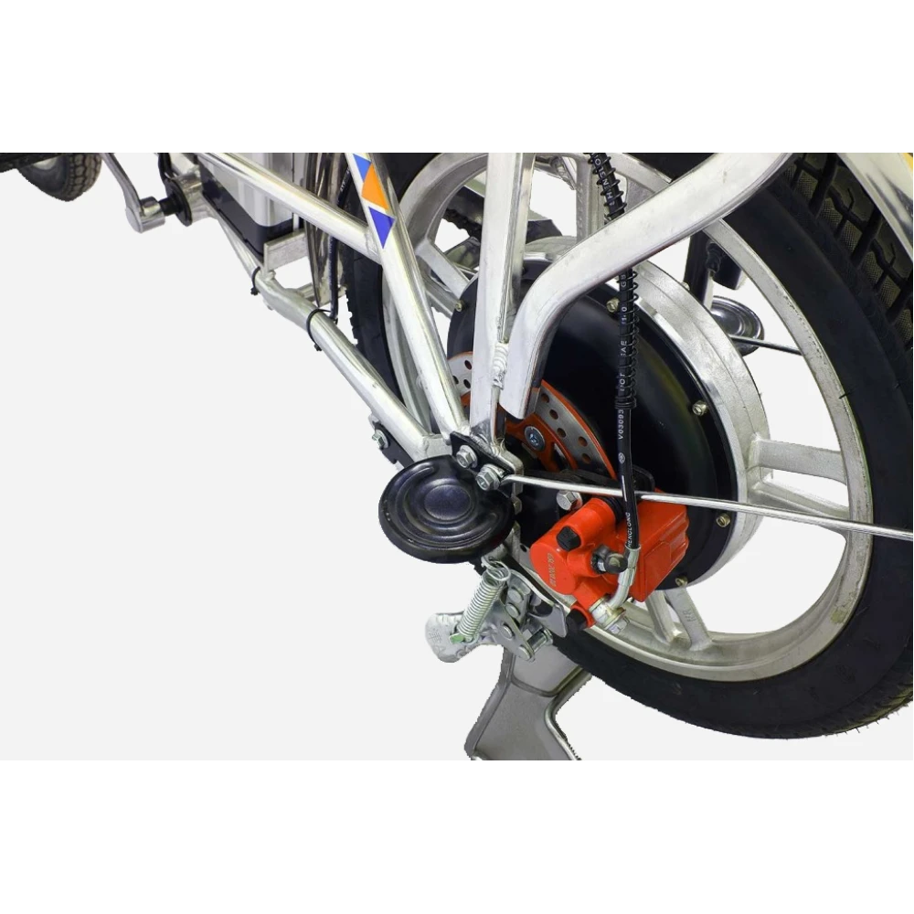 При мощности двигателя 350 Вт техника способна развивать скорость до 45 км/час и преодолевать на одной подзарядке 55 км пути, на педальном режиме – в 1.5-2 раза больше. Емкая АКБ на 13 Аh закреплена за сиденьем райдера, не мешает при переходе на педальный режим.