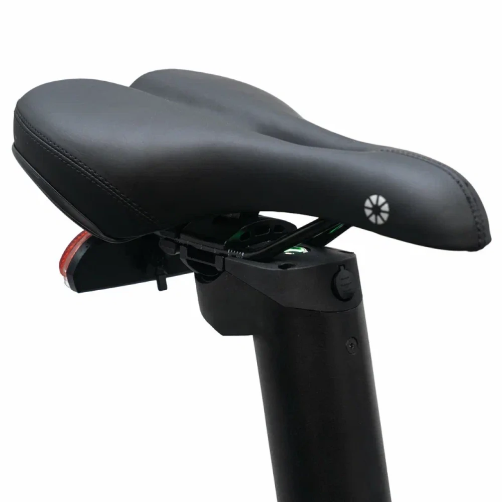 Механические дисковые тормоза обеспечивают тормозной путь 3-4 м со 20 км/ч, вилка Hi-Ten Steel гасит вибрации, освещение (фары/отражатели) стандартное. Соответствует CE-стандартам; меры для аккумулятора — BMS-защита от перегрева, короткого замыкания. Нет GPS-трекера или сигнализации; рекомендации: шлем, скорость до 20 км/ч в городе, проверка тормозов.
