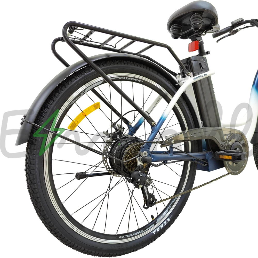 Рама изделия усовершенствована. Стала максимально легкой благодаря изящному алюминию. Рулевая часть велогибрида оснащена LCD-велокомпьютером Eltreco M3, благодаря которому удобно отслеживать скоростные характеристики, заряд АКБ и другие параметры.