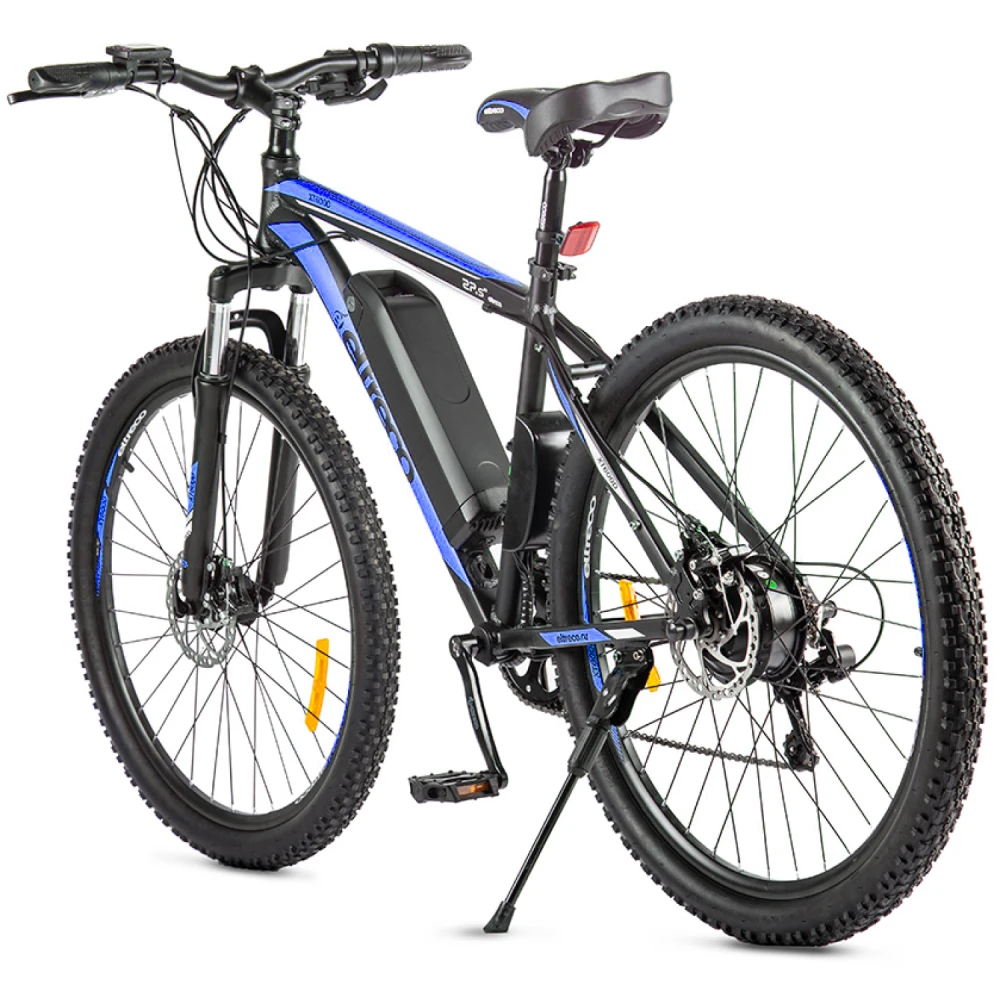 Велогибрид Eltreco XT 600 – доступная и востребованная на рынке электровелосипедов модель. В сравнении с предыдущими вариантами имеет облегченную алюминиевую раму, сглаженную геометрию, в которой нельзя найти острых углов. черно-синяя модель велосипеда сочетает в себе роскошь и многофункционал. Общий вес велика – 20 кг. При разработке модели производитель использовал оригинальные брендовые запчасти, что сделало срок службы техники длительным. Технические особенности электровелосипеда следующие: