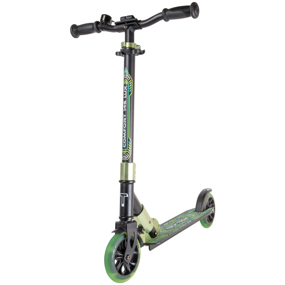 Самокат Comfort 145 Lux 2022 черно-зеленый – для мальчиков и девочек 5-летнего возраста стал настоящим сюрпризом. Характеристики техники обеспечивают стопроцентную безопасность ездока, позволяют совершенствовать навыки передвижения в пределах города и парковой зоны. Купить самокат по разумной цене, воспользоваться другими бонусами предлагает наш интернет-магазин.
