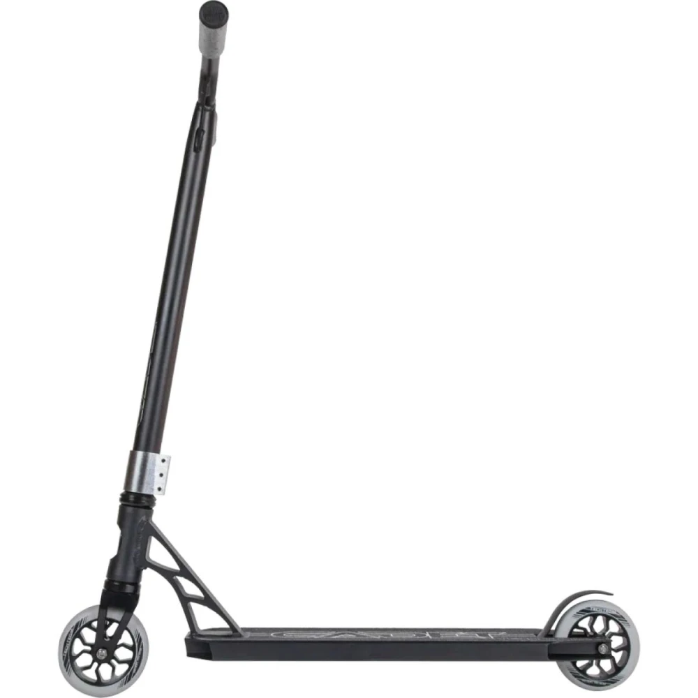 Рулевая стальная часть «Y»-образной формы по высоте от зажима составляет 57 см, от поверхности – 79,5 см. Ширина и длина – 54см*34,9см соответственно. Самокат оснащен прорезиненными грипсами и фирменными барендами, которые исключают травмирование, обеспечивают крепкую фиксацию рук. Трюкачи утверждают, форма грипс удобная, не провоцирует запотевания и случайного соскальзывания рук.