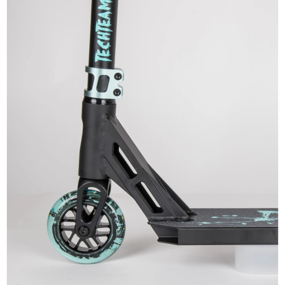 Качественная колесная часть с черно-бирюзовыми полиуретановыми колесами способна сотворить чудеса, выполнять рискованные трюки слушаясь пользователя на 100 %.