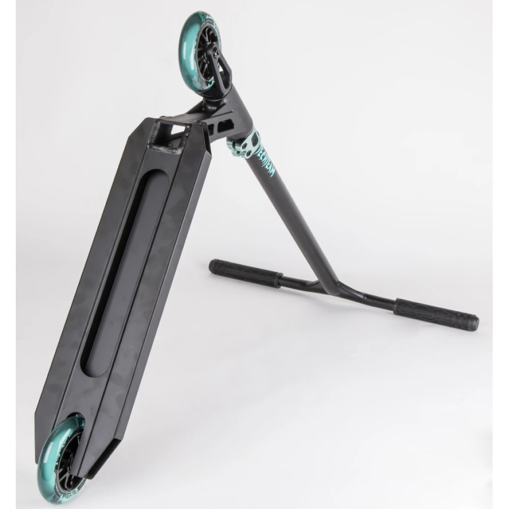 Модель совершенствована. Подтверждением тому являются особые параметры деки, которая изготовлена с применением прочного и надежного алюминия 6061 прошедшего теплообработку Т6. Наличие пластикового тормоза с гидравлической вставкой в сочетании с профессионализмом райдера гарантируют его безопасность и качественное выполнению трюков.