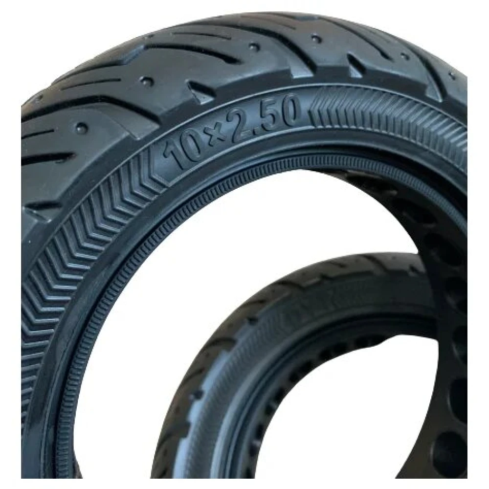 Литая/бескамерная покрышка 10Х2.50 ДЛЯ KUGOO/JOYOR имеет перфорацию для самокатов, что обеспечивает более плавный ход. Это отличный вариант, если вы хотите кататься не только по ровной дороге, но и по бездорожью, не переживая за проколы колеса.